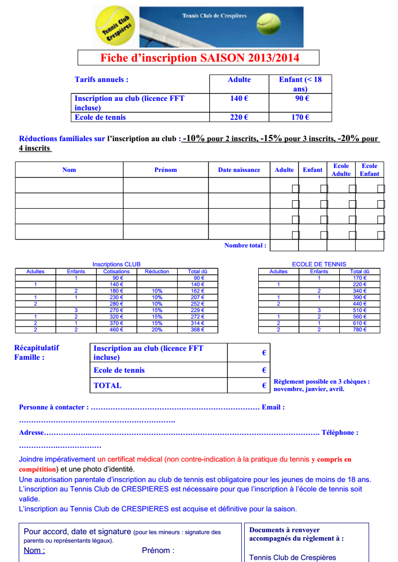 Afin de pouvoir bénéficier de l'accès aux courts de tennis, il est impératif d'être à jour de sa cotisation pour la saison en cours. Enregistrez et/ou imprimez le document ci dessous et transmettez le nous (un casier au nom du TCC est à votre disposition à la Mairie).
